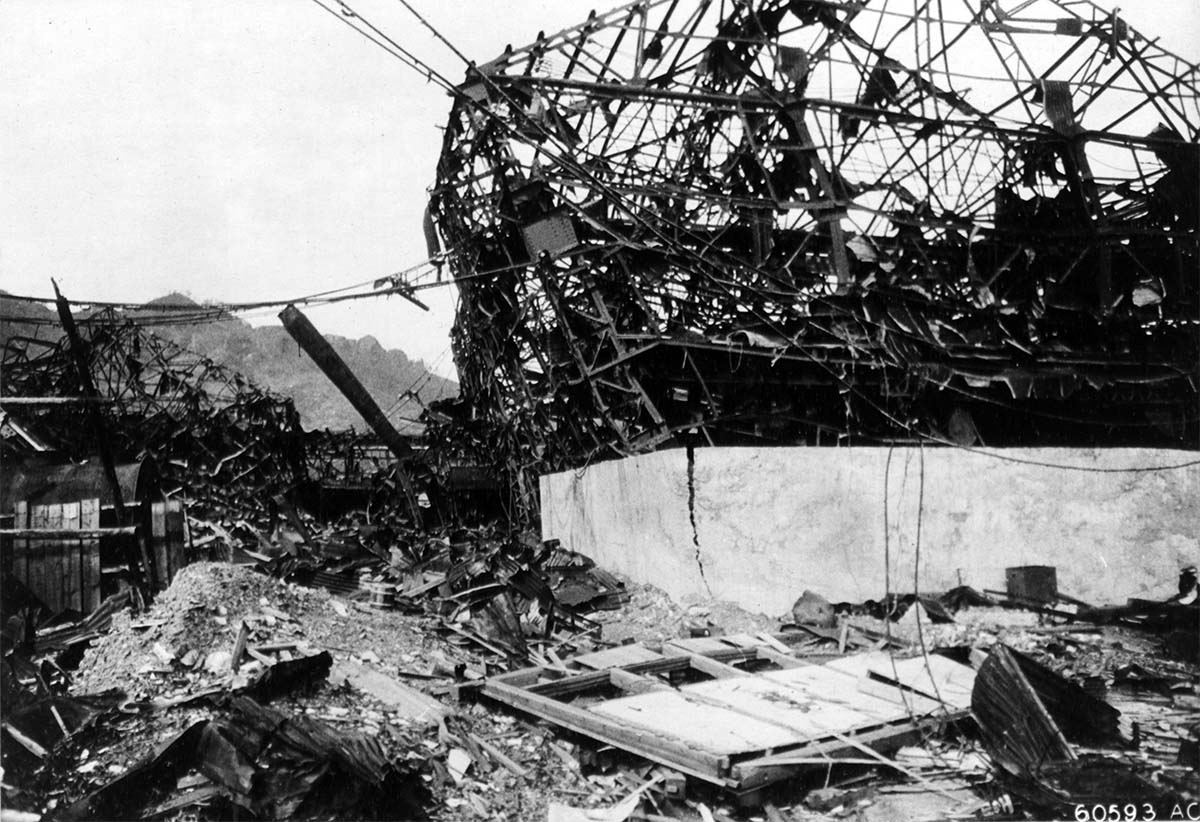 Steel-framed building about 4,000 feet south of ground zero in Mitsubishi Steel and Arms Works distorted to grotesque shape by blast of bomb.